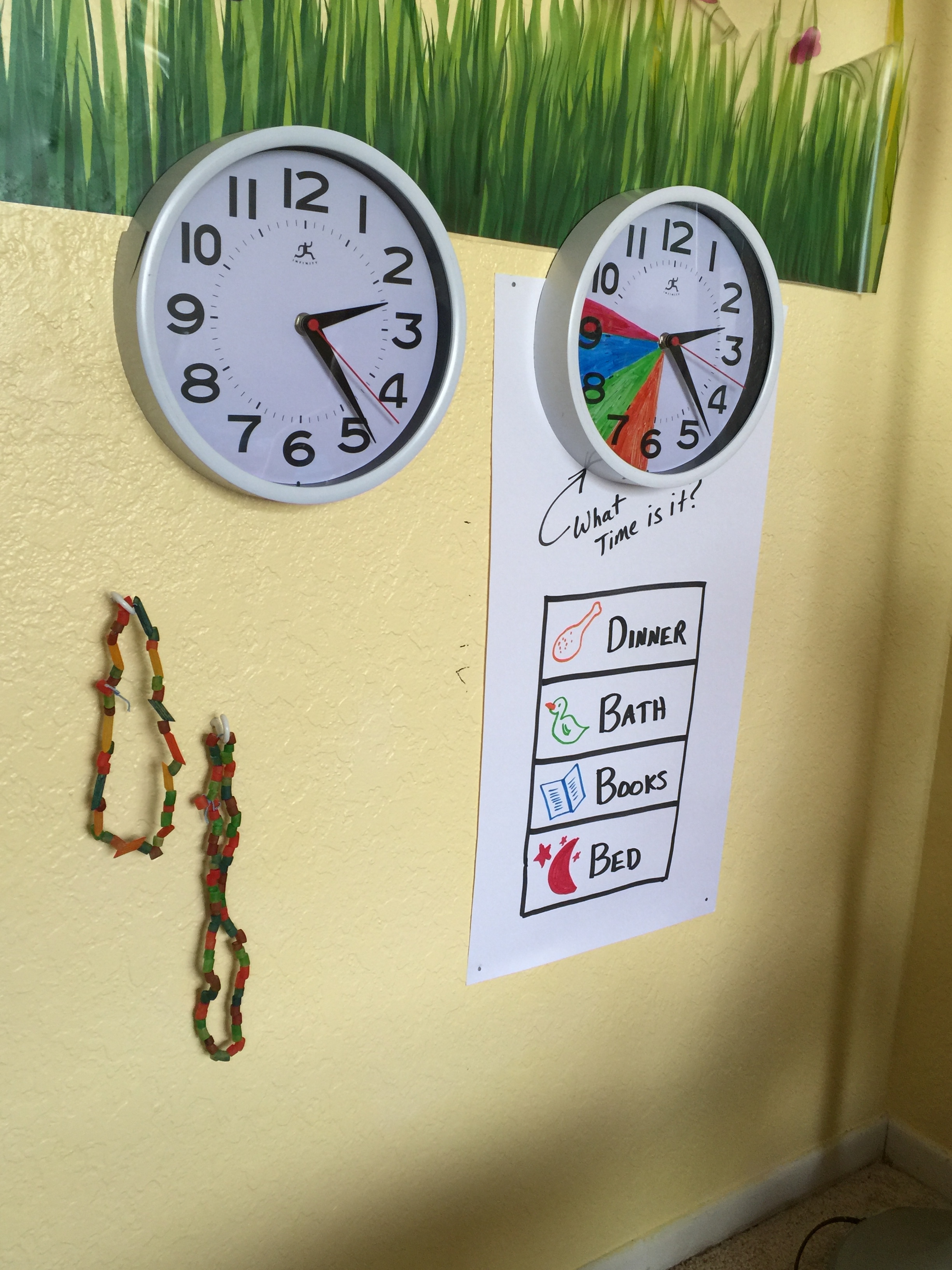 It's not worth the fight. Fighting with your little one about what time it is (time for baths, time for bed, etc) is an endless battle. And what's worse is they can't tell time yet anyway! So they just keep saying 5 more minutes. haha We created this night time clock and colored it so that our toddler knows a little more about what time it "really" is: Dinner, Bath, Books & Bed.